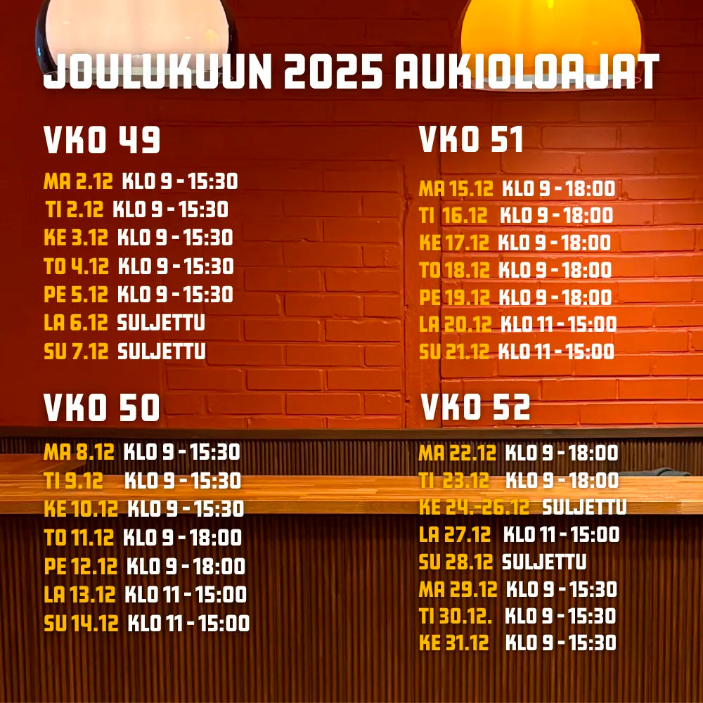 Olemme normaalisti avoinna arkisin klo 9 - 15:30 ja lauantaisin klo 11 - 15. Poikkeuksellisista aukioloajoista ilmoitamme tällä sivulla.